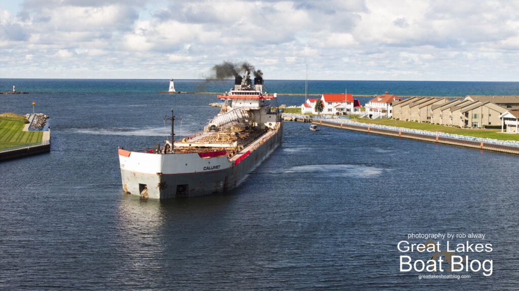 After leaving Ludington, the Calumet was traveling to Manistee to deliver the remainder of its load at the Rieth-Riley Construction dock along Manistee Lake.