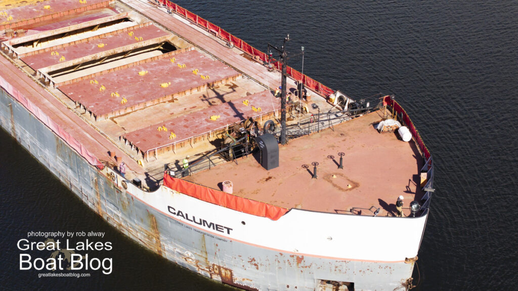 The Calumet is 630 feet long, 68 feet wide and has a depth of 36-feet, 11-inches. It is propelled by two Alco V16 diesel engines and can run up to 14 knots (16 mph).