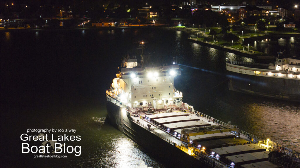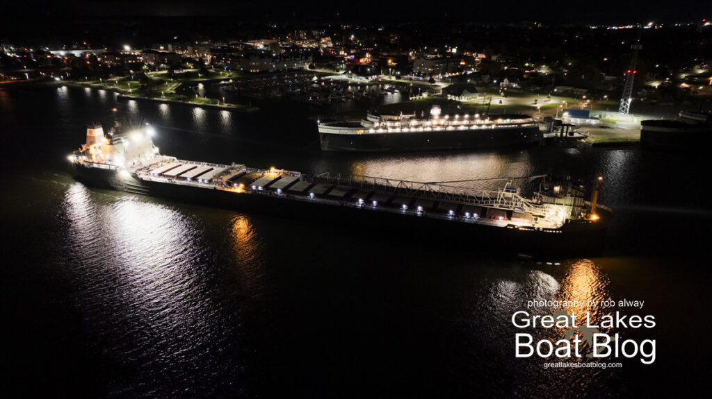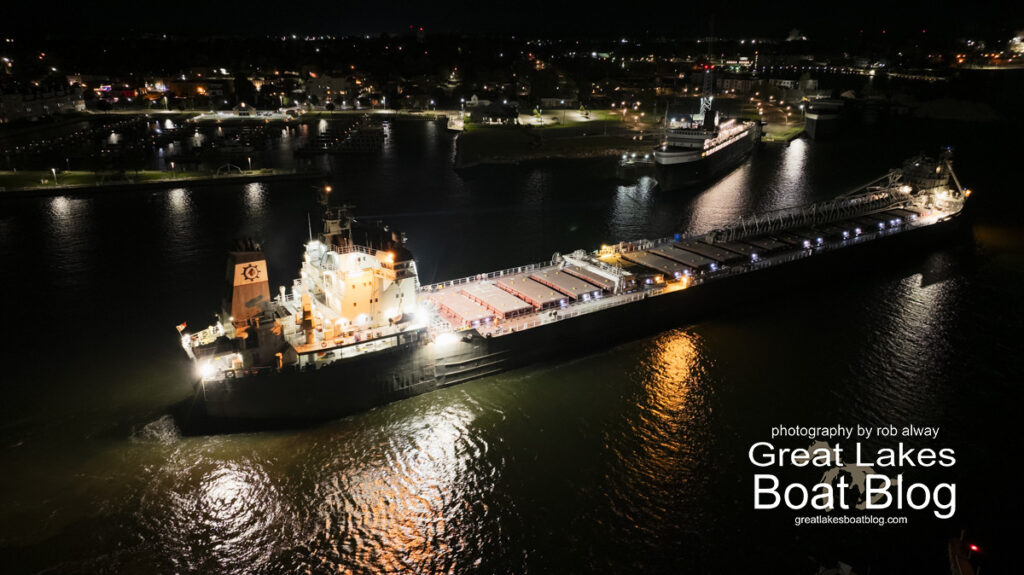 The Manitoulin’s fleet sister, M.V. Calumet, is expected to arrive in Ludington today at 4 p.m., also destined for the Rieth-Riley Construction Dock. The Calumet is an American-flagged vessel operated by Grand River Navigation.